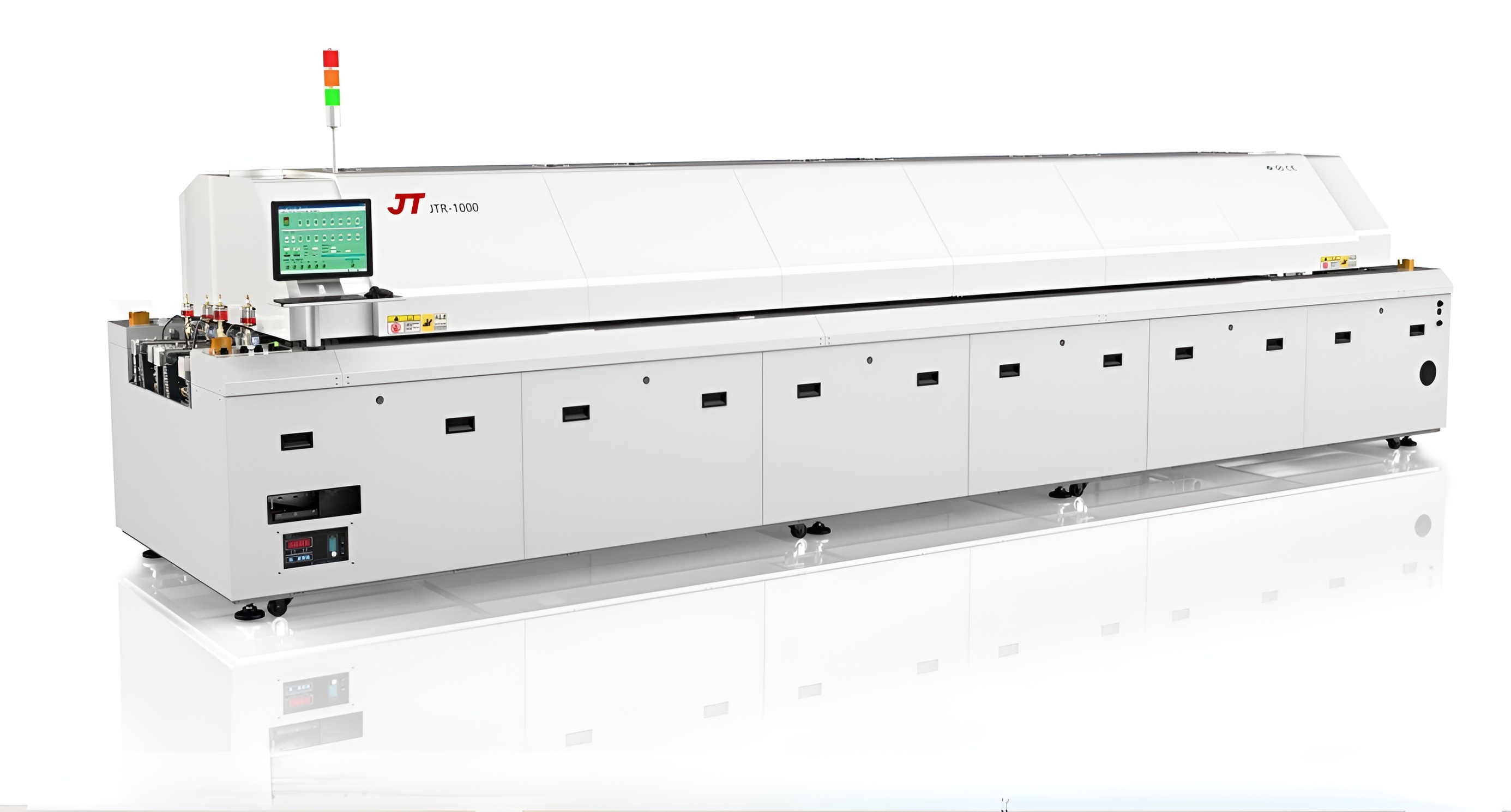 多層保溫爐膛設計,爐體外殼表面溫度降低10度至20度,有效降低工作環境溫度。 15%熱傳遞效率的提升從容應對更復雜更大型焊接產品的無鉛工藝要求。 加強主吊臂確保導軌無橫向變形。 爐膛內使用全面保護的密閉式設計,有效保護氮氣不易流失。 氮耗量低,在300-800ppm氧濃度環境下只在20-22m3/H。 機器上95%的材料可以循環再用。 新式冷卻結構設計使大部分廢氣過濾或回收后返回爐內。 工作爐體表面溫度低,熱損耗極小。